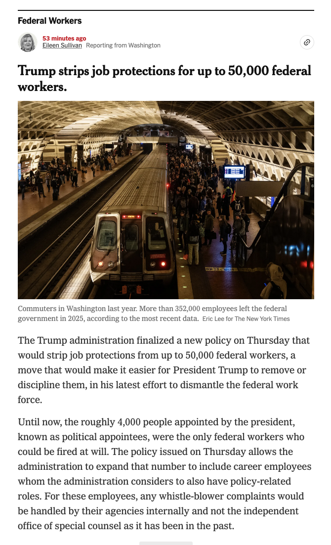 A recent New York Times headline reads “Trump strips job protections for up to 50,000 federal workers.” The caption under the photo reads “More than 352,000 employees left the federal government in 2025, according to the most recent data.”